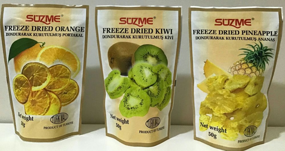 FREEZE DRIED FRUITS are crispy,delicious and nutritive fuits,thanks to drying techic Premium Seasonal Fresh Fruits are selected and washed,then are dried by freezing in the form of Whole,Sliced,Halved,Cut in various dimensions and in Powder.They could be in bulk for foods services,catering and industry as ingredient or in small consumer packs. They can be consumed as snack or by adding milk with serials in Breakfast. They could be used in muslie too.Why FREEZE DRIED FRUITS? Because;*No additive and no colorant agents. So it is healty.*Safe from Afloatoxin and Ochratoxin issues.*Never lost original Color,Taste and Nitrutional Values of their fresh ones.*Consumers enjoy the taste as if they ate fresh Fruits.*Crispy and enjoyable. |
